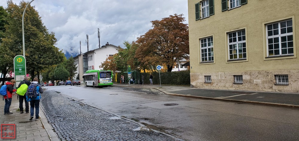 去艾比湖的巴士呢,沒有號碼,叫EibseeBu。可那台巴士寫的不是EibseeBu而是EVG,猜想是巴士公司的名字? 幸好有寫終點站是Eibsee啦。又下雨又要打著傘,差點找不到站牌錯過了班次。巴士站不是火車站出來的那一個,要稍為走遠一點點,谷歌地圖搜出來的路線是對的,站點卻有偏差,那條路上有兩個巴士站,在相片中看到馬路對面那個、在郵局旁邊的那個小小的站牌才是,EibseeBu在站牌上以藍色標示。